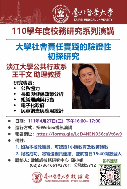 【校內活動】111.04.27臺北醫學大學辦理「大學社會責任實踐的驗證性初探研究」講座