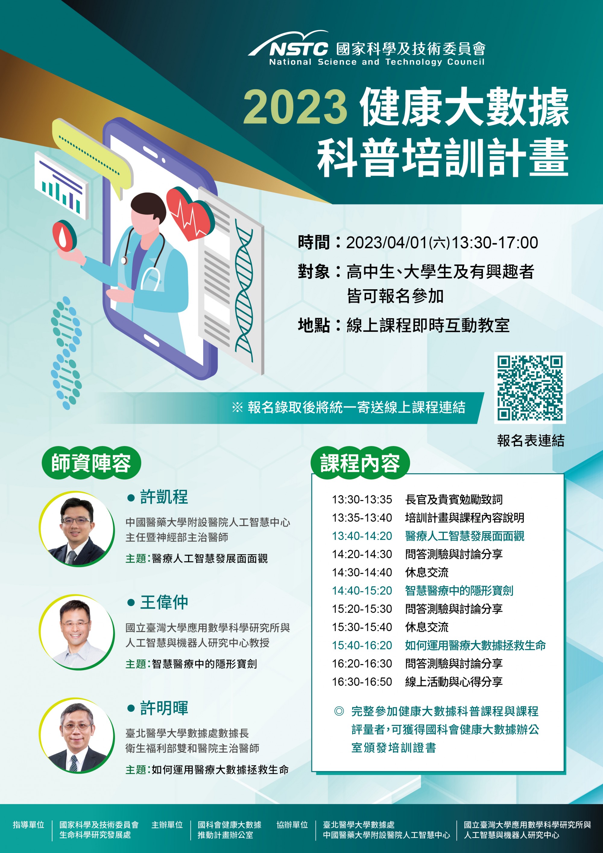 由國科會健康大數據推動辦公室主辦,臺北醫學大學、中國醫藥大學附設醫院及國立臺灣大學共同協辦,健康大數據科普培訓計畫重量級師資陣容與精彩講題,歡迎對健康大數據科普課程活動有興趣之高中生、大學生及有興趣者報名參加,超級難得的免費科普培訓課程活動,歡迎大家把握機會,踴躍報名參加!