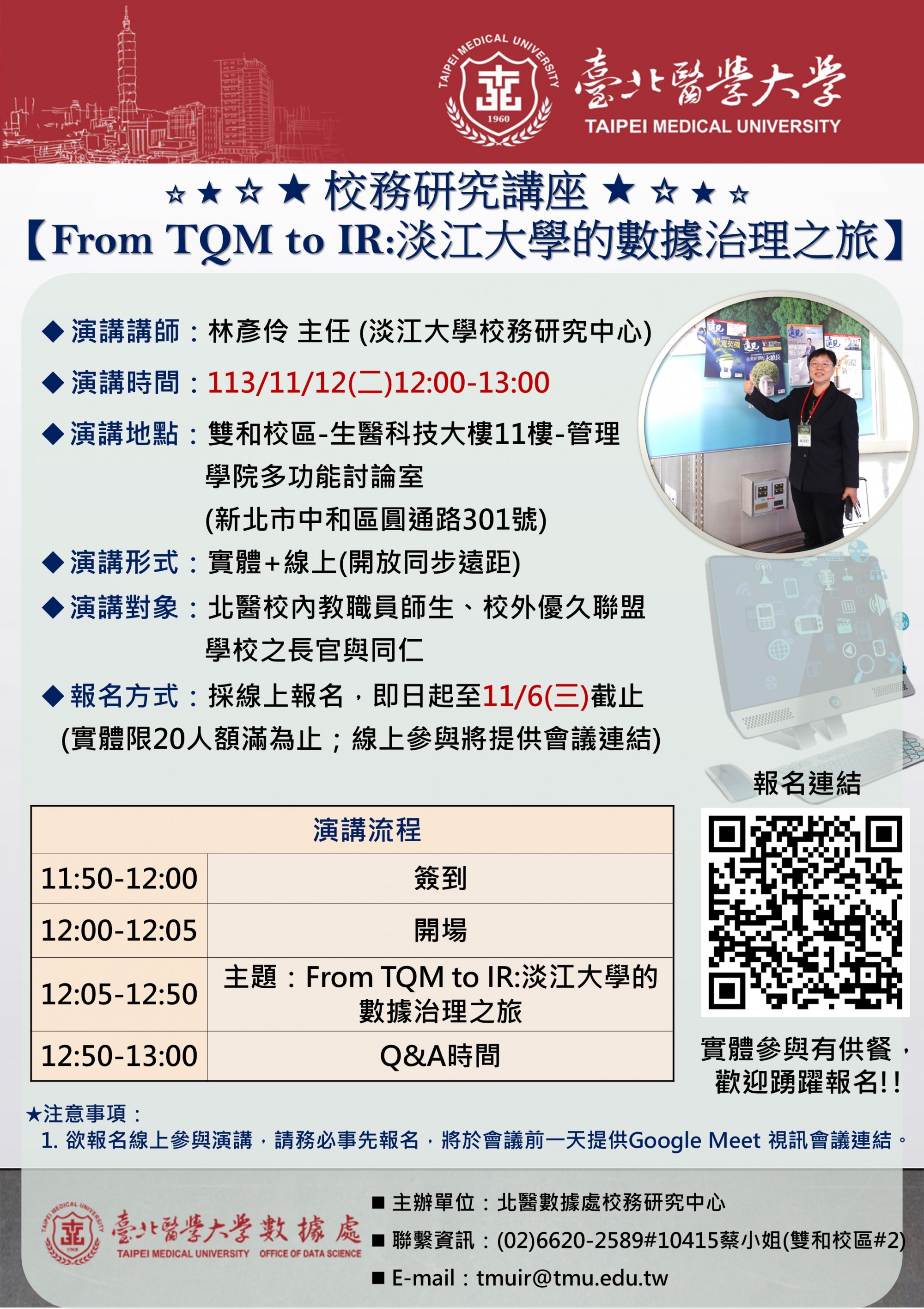 【敬邀參與】113/11/12(二) 臺北醫學大學-數據學術月會校務研究講座「 From TQM to IR:淡江大學的數據治理之旅」,歡迎校院師長、同仁報名參加!!!