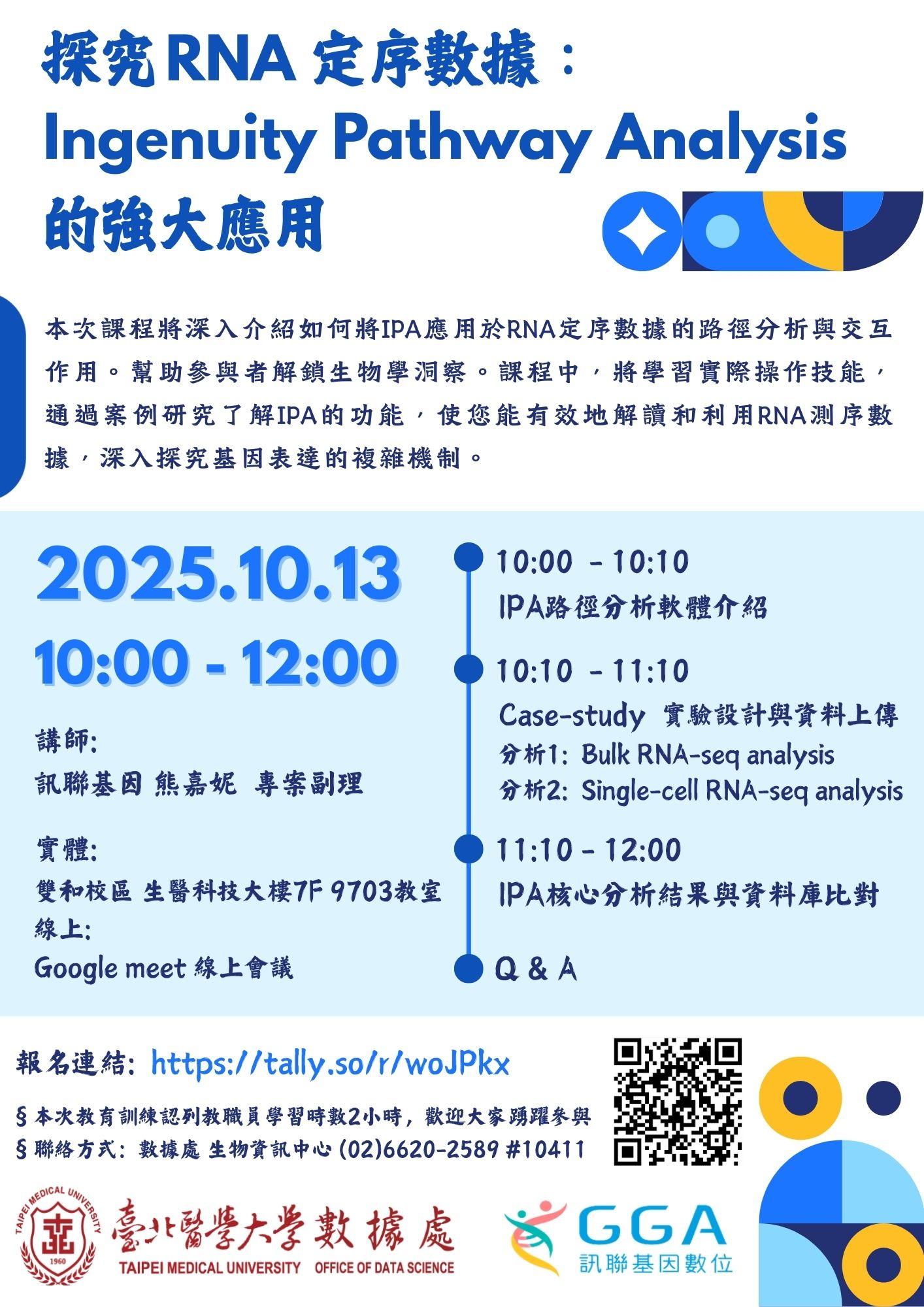 【敬邀參加】數據處學術月會 探究RNA定序數據,Ingenuity Pathway Analysis的強大應用