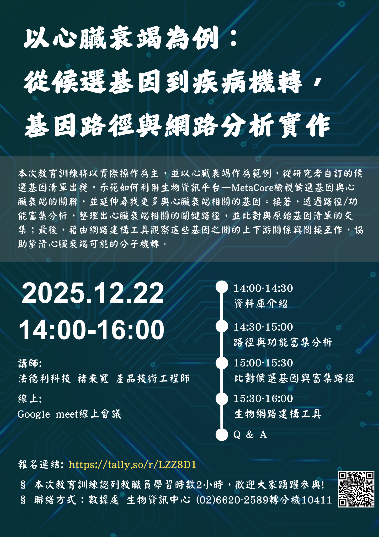 【敬邀參加】2025/12/22 數據處月會:以心臟衰竭為例:從候選基因到疾病機轉,基因路徑與網路分析實作