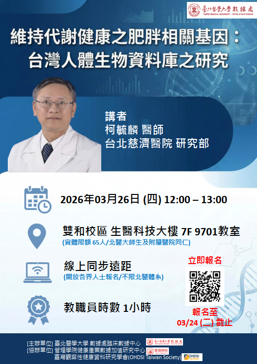 臺北醫學大學數據處臨床數據中心將於2026/03/26 (四) 數據學術月會講座「維持代謝健康之肥胖相關基因: 台灣